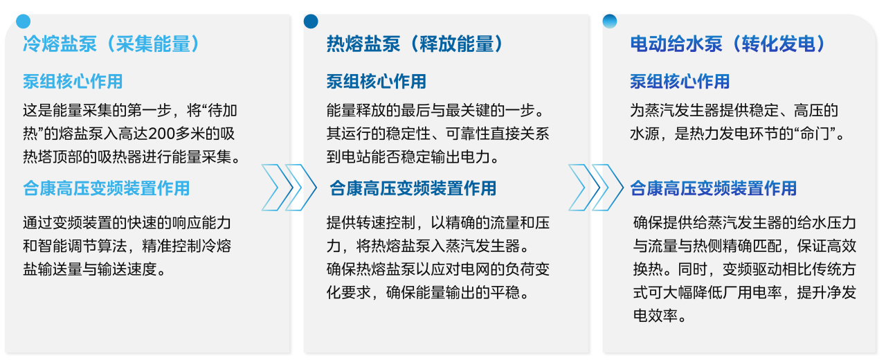 在这一重大的光热发电系统中,,,,,,,HJC黄金城官方网站新能高压变频装置肩负着对要害装备的焦点调控重任,,,,,,,通过强盛可靠的变频手艺将这三大概害泵组串联起来实现高效稳固运转,,,,,,,构建了从能量收罗贮存、释放到电能转换的完整能量流: